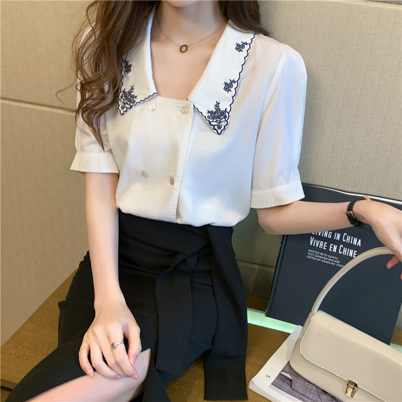 This structured puff sleeve top features a statement embroidered collar and tailored silhouette — blending Korean minimalism with soft French elegance.